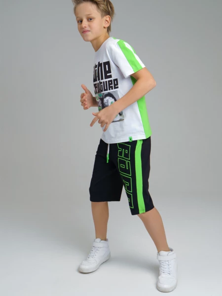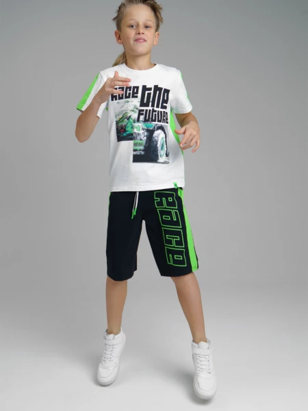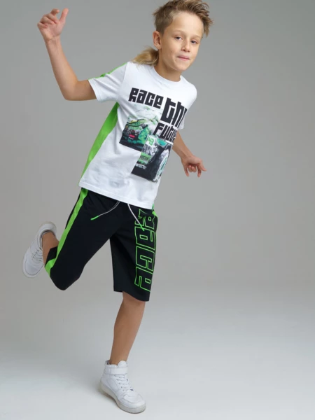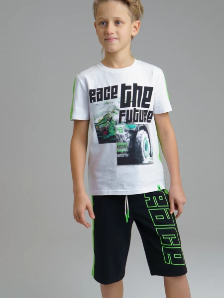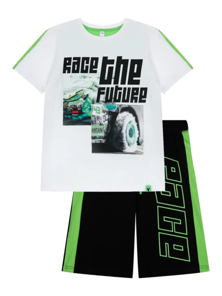 RACE THE FUTURE tween boys белый,зеленый,черный 95% хлопок, 5% эластан Комплект: футболка, шорты. Размер изделия на фото - 140, параметры модели (см): рост 146, обхват груди-талии-бедер: 67-63-71. Из качественного эластичного и приятного на ощупь трикотажа джерси. Высокое содержание хлопка 95%. Благодаря наличию эластана в составе ткани изделие держит форму и меньше мнется. Принт сохраняет первоначальный вид даже после многочисленных стирок. Эластичный пояс с тесьмой позволяет легко надевать и утягивать до идеальной посадки в зависимости от комплекции ребенка.