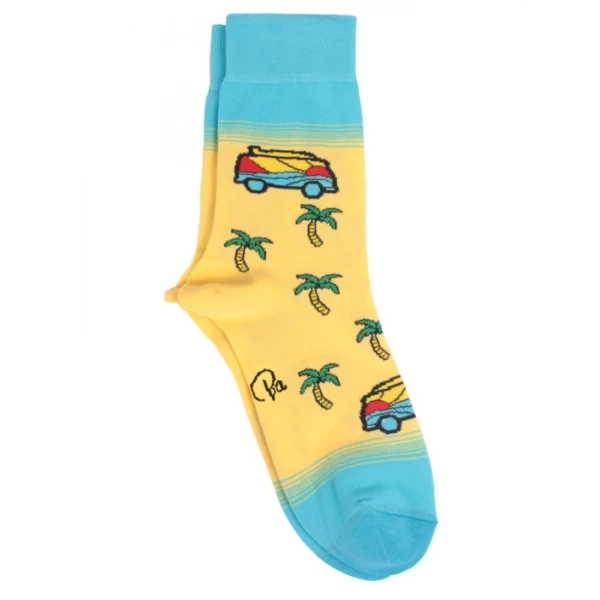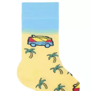 Наши цветные носки с принтом 'Серфинг' - это идеальный способ принести волну радости и приключений в вашу жизнь. С этих носков словно дунул морской бриз. Фон песочного цвета создает атмосферу бескрайних пляжей и солнечных дней. Минивен с доской на крыше напоминает о важности свободы и приключений. Пальмы, вздымающиеся на горизонте, добавляют нотку тропического настроения, а голубой океан напоминает о бескрайних водах и бесконечных возможностях.