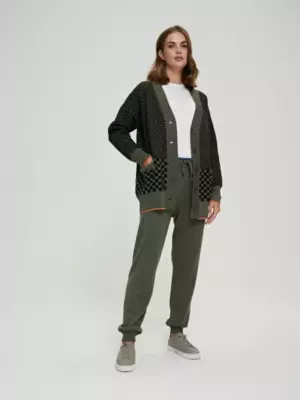 Вязанные брюки-джоггеры из хлопка - прекрасный вариант для прогулки в прохладную погоду. Модель фиксируется на талии на резинке и эластичной резинке на нижней части брючин. Силуэт свободный, на резинке на талии декоративная контрастная полоса. Для создания полного монохромного образа рекомендуем сочетать брюки с нашим джемпером SS 211.070243, Состав: 50% акрил;50% меринос