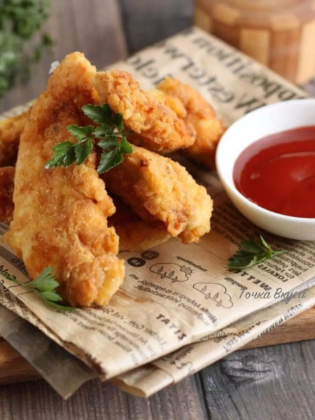Куриные стрипсы — это нежные кусочки куриного филе ЦБ в хрустящей панировке. Они очень похожи на классические наггетсы, но больше по размерам и немного отличаются способом приготовления.