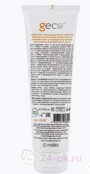 GECO Защита от УФКрем для защиты кожи лица и рук от воздействия УФ излучений диапазонов А, В, С(туба 100 мл.) С КРЫШКОЙ ФЛИП-ТОП