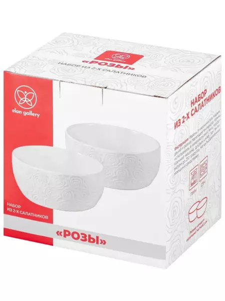 Набор из двух салатников Elan Gallery "Розы" выполнен из белого фарфора с рельефным узором. Размер каждого салатника – 14х14х6,3 см, объём – 600 мл. Используйте тарелочки для любых закусок и угощения гостей на празднике или вечеринке. Подойдут не только для салатов, можно использовать для сервировки любых сладостей, например, конфет или печенья. Положите в фарфоровую ёмкость кабачковую икру или свежие овощи, чтобы порадовать гостей. Можно использовать в микроволновой печи и мыть в посудомоечной машине. Поставляются в стильной картонной упаковке. Подарочные фарфоровые блюда порадуют ваших близких на любой праздник. Кухонный инвентарь с рельефным узором в виде цветов станет незаменимым помощником при сервировке стола и предметом декора вашего дома!