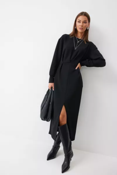 Платье полуприлегающего силуэта из трикотажного полотна. Горловина округлая. Рукав со спущенной линией плеча по низу манжета. Платье отрезное по линии талии. По переду на талии складки. В боковом шве функциональные карманы. В центральном шве юбки разрез.