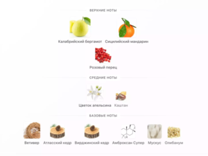 Верхние ноты: розовый перец, бергамот, мандарин, флердоранж, каштан