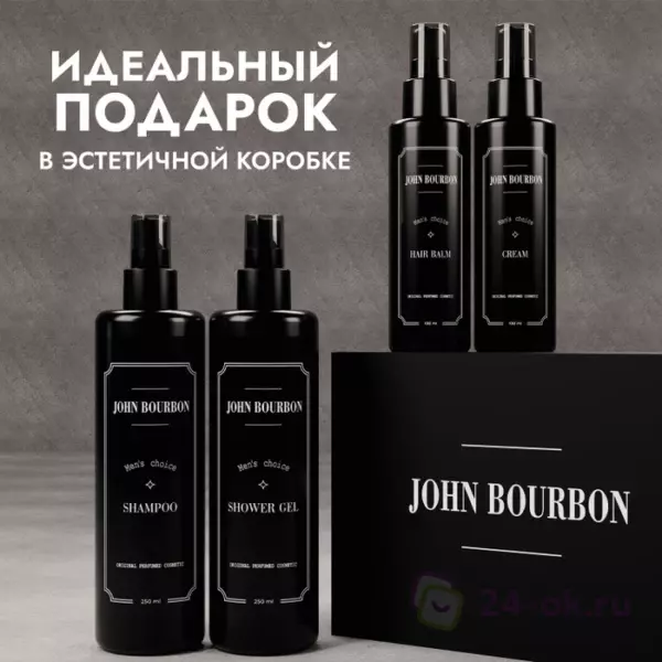 "Подарочный мужской набор ""John Bourbon"" – идеальный подарок для современного мужчины, который ценит качественный уход за собой! Этот роскошный набор содержит все необходимое для полноценного ухода: шампунь, гель для душа, увлажняющий крем и бальзам для волос. Все продукты имеют приятный мужской аромат с нотами удового дерева и бергамота, которые подчеркнут ваш стиль и образ. Шампунь и бальзам для волос создают полноценный комплекс ухода за кожей головы, волосами и бородой. Они обогащены ухаживающими компонентами, которые придадут вашим волосам блеск и здоровый вид, а парфюмированный состав подарит неповторимый аромат. Гель для душа нежно очищает кожу, оставляя ее освеженной и увлажненной, а увлажняющий крем с чайным деревом обеспечит максимальное увлажнение и питание кожи на протяжении всего дня. Компактный объем набора делает его идеальным для поездок и путешествий.