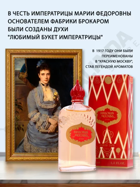 В честь императрицы Марии Федоровны Брокаром были созданы духи "Любимый букет императрицы", затем они были переименованы в 1917 году в духи "Красная Москва". Духи стали легендой ароматов и приобрели несравненную популярность в России и за её рубежами, а легендарная "Империя Брокара" превратилась в "Замоскворецкий парфюмерно-мыловаренный комбинат № 5", а затем в фабрику "Новая Заря". Для изготовления этого аромата и по сей день используются практически только натуральные ингридиенты. Верхние ноты аромата - бергамот и нероли, дополненные грейпфрутом и кориандром. Затем резкость этих нот сменяется бархатистыми тонами жасмина, розы, иланг-иланга с легкой примесью мускатного ореха. Шлейф аромата - роскошное сочетание ирисов, ванили, амбры и бобов.