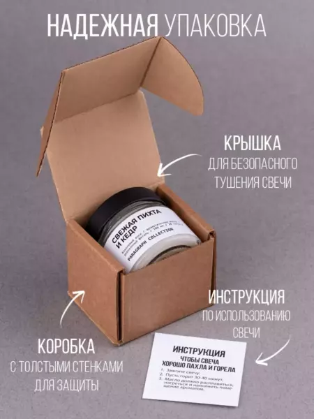 Свеча состоит из 100% натурального кокосового воска, ароматов с маслами, деревянного фитиля. Благодаря натуральным компонентам свеча безопасна и не выделяет вредных веществ. Эта ароматическая свеча идеально подойдет для создания приятной атмосферы перед сном, во время завтрака, романтического и семейного ужина, занятия йогой.