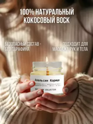 Свеча состоит из 100% натурального кокосового воска, ароматов с маслами, деревянного фитиля. Благодаря натуральным компонентам свеча безопасна и не выделяет вредных веществ. Эта ароматическая свеча идеально подойдет для создания приятной атмосферы перед сном, во время завтрака, романтического и семейного ужина, занятия йогой.