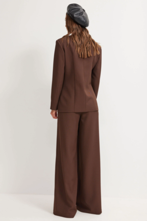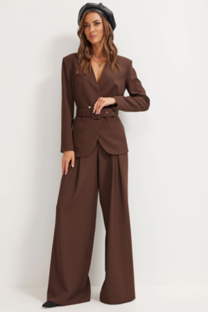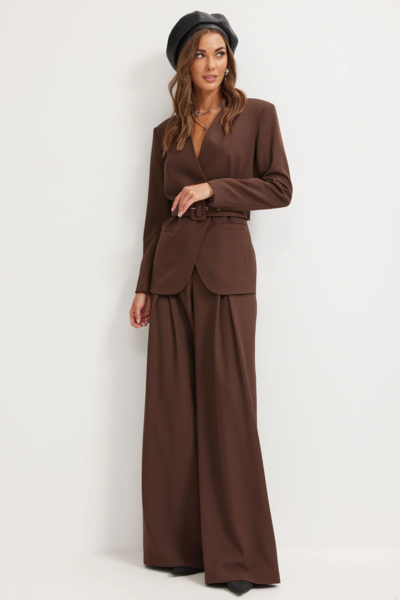 Жакет полуприлегающего силуэта из костюмной ткани. Жакет с двубортной застежкой и V-образным вырезом горловины. Рукав втачной двухшовный. По переду функциональные карманы с листочкой, рельефы и нагрудные вытачки. На спинке средний шов и талиевые вытачки. Жакет на подкладке. В комплект входит ремень.