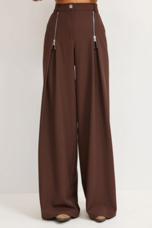 Брюки прямого силуэта из костюмной ткани. По верху брюк притачной пояс с застежкой на петлю и пуговицу и шлевками для ремня. На передних половинках обработаны карманы и застежка молния в среднем шве. Передние половинки брюк со встречной складкой, в которой расположена декоративная молния. На задних половинках вытачки. По поясу задних половинок брюк резинка (от вытачки до вытачки).