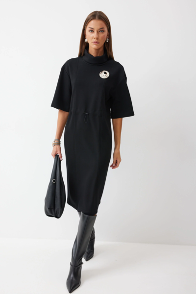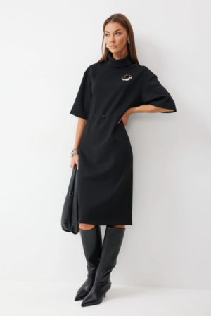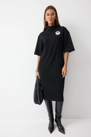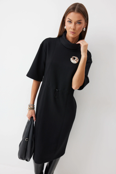 Платье прямого силуэта из трикотажного полотна. Горловина-стойка. Рукав со спущенной линией плеча, с коротким рукавом. На спинке в центральном шве по низу разрез. По переду и спинке декоративные рельефы. В районе талии кулиса с фиксатором для регулирования степени прилегания. В комплект входит съемная брошь. Обращаем ваше внимание, что фурнитура может отличаться от фото.