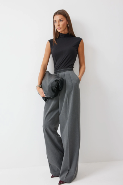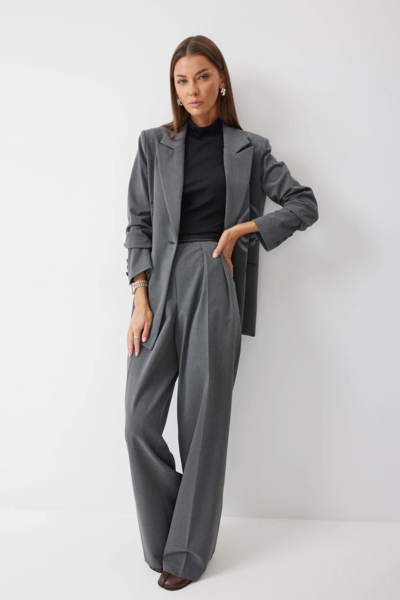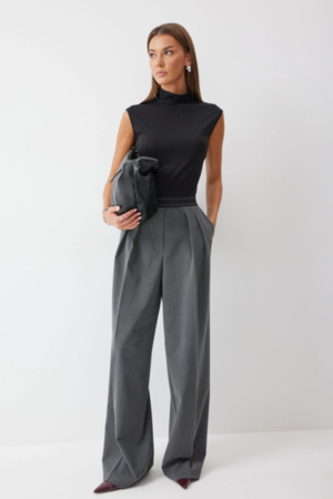 Брюки прямого силуэта из костюмной ткани. По верху брюк декоративная резинка. На передних половинках карманы и декоративные складки. На задних половинках вытачки. Обращаем ваше внимание, что фурнитура может отличаться от фото.