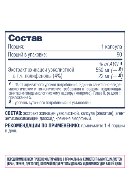 | Экстракт эхинацеи узколистной в т. ч. полифенолы (4%) | 550 мг 22 мг |