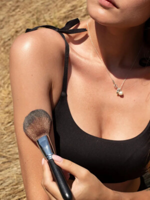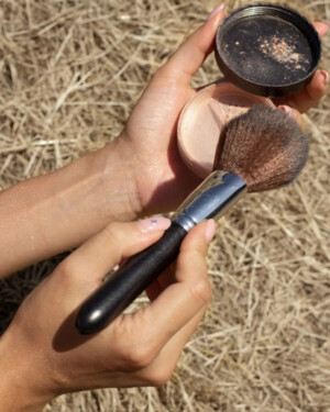 Наносите пудру на всё тело или на отдельные места (ключицы, шею, ноги) мягкой пушистой кистью.