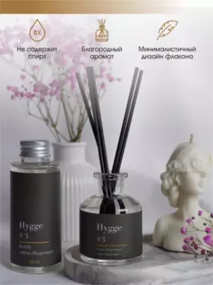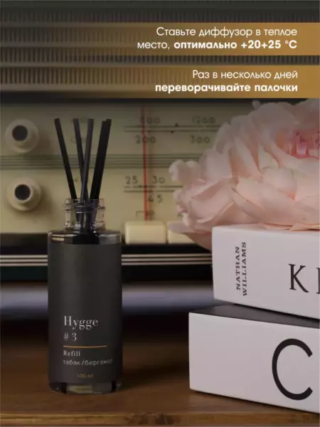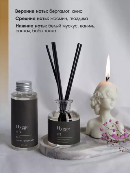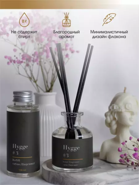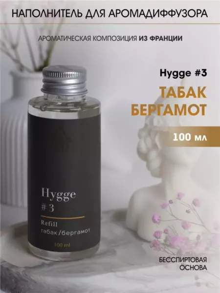 HYGGE #3 Табак-Бергамот - Пикантный, глубокий, окутанный дымкой аромат, заполняет пространство на уровне чувств. Входящий в состав запах бобов Тонка, часто используемых в ароматерапии, придает интимную ноту. Отдайтесь успокаивающему блаженству. Верхние ноты: бергамот, анис; средние ноты: жасмин, гвоздика; нижние ноты: белый мускус, ваниль, сантал, бобы тонка. Чтобы жидкость начала источать запах, наполните ею диффузор и установите в емкость необходимое количество новых фибровых или ротанговых палочек.