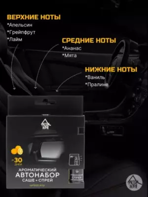 Верхние ноты: апельсин, грейпфрут, лайм Средние ноты: ананас, мята Нижние ноты: ваниль, пралине Состав: Саше: гранулы природного материала, пропитанные ароматической эссенцией Спрей: основа не содержащая этиловый спирт, ароматическая композиция