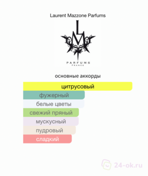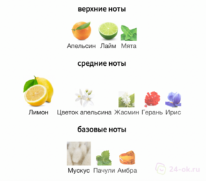 Ноты: ирис, цветок апельсина, герань, лайм, лимон, амбра, пачули, жасмин, апельсин, мята, мускус