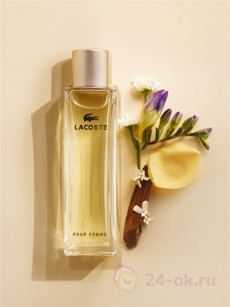 Это современное выразительное творение, которое пробуждает женскую искреннюю непосредственность и вызывает в мужчинах полный восторг. Верхние ноты аромата Lacoste Pour Femme это смесь ямайского перца и пурпурной фрезии выражают очарование быть просто женщиной и истинную энергию, которая исходит от каждого момента жизни. "Сердце" построено вокруг нот великолепного и на редкость женственного аромата иранского жасмина, слегка оттененного аккордами белого гелиотропа, гибискуса и болгарской розы. Томные и притягательные, глубокие оттенки гималайского кедра и сандалового дерева придают шлейфу Lacoste pour femme удивительную чувственность и интимность. Незабываемый обволакивающий аромат ладана привносит некий мистический элемент, а уникальная нота "бархатистая кожа" окутывает и возбуждает своей мягкостью, которая напоминает прикосновение к женской коже.