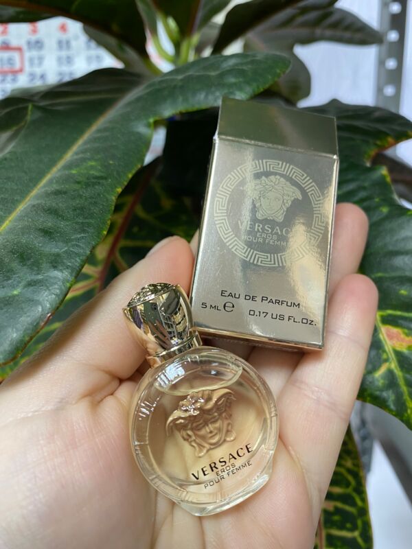 Авторами ароматного творения выступили трио парфюмеров из компании Firmenich – Alberto Morillas, Olivier Cresp и Nathalie Lorson. Ароматическое чудо, созданное их талантом, они облекли в необыкновенный сосуд – плоский флакон, украшенный двумя золотыми дисками с греческим орнаментом по ободу и изображением головы Горгоны-Медузы, являющимся символом дома Версаче. Парфюмерная композиция Eros Pour Femme открывается нотами калабрийского бергамота, сицилийского лимона и граната. Сердце звучит аккордами жасмина самбака, лимонных цветов и пиона. База из нот древесины, мускуса, сандала и молекулы амброксан завершает ансамбль.