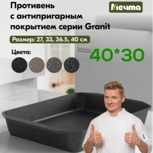 Противень изготовлен из высококачественного пищевого алюминия с антипригарным покрытием, что обеспечивает ему прочность и долговечность. Антипригарное покрытие не вступает в реакцию с продуктами питания. Противень быстро и равномерно нагревается, поэтому блюда в нем хорошо пропекаются.