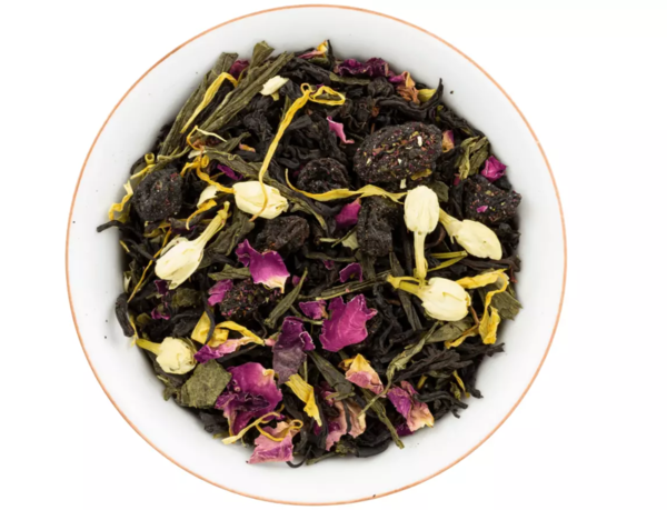 Черный и зеленый чай. Лепестки розы, манго, изюм, цветы подсолнечника и мальвы.