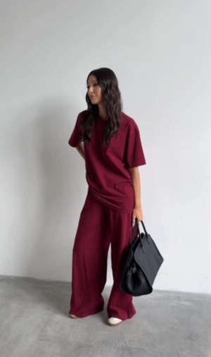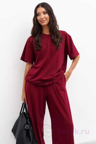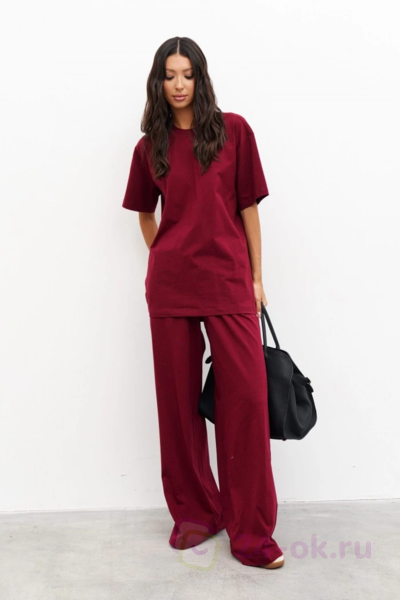 Состав: 92 хл 8 эл Описание: Комплект 2-х предметный, состоит из футболки и брюк выполнен из хлопкового полотна цвета бордо. Характеристики: футболка прямого свободного кроя, овальный вырез горловины, рукав втачной спущенный . Длина по спинке от края горловины 70 см, длина рукава от края горловины 37 см. Брюки прямого свободного кроя, пояс на резинке, в боковых швах карманы. Длина брюк по боковому шву 112 см.