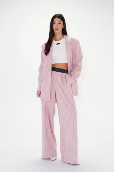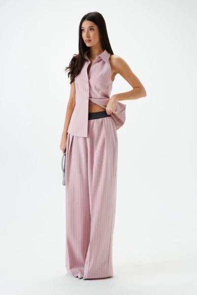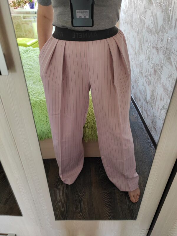 Состав: 47пэ29вис22пан2эл Описание: Брюки прямого свободного кроя. Выполнены из текстильного полотна нежно-розового цвета с принтом вертикальная полоска. Пояс брендированный на резинке, защипы по переду, в боковых швах карманы, стрелки заутюжены. Длина по боковому шву 110 см.