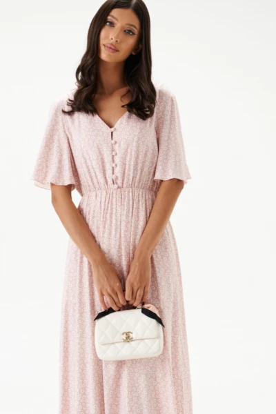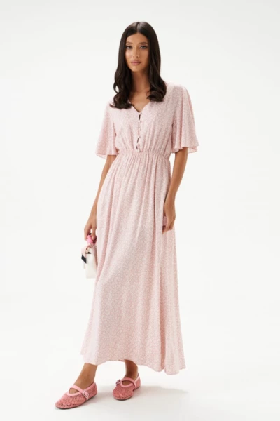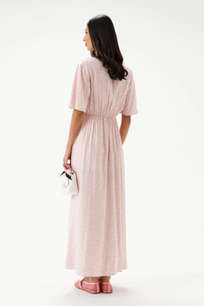 Описание: Платье полуприлегающего силуэта выполнено из нежно-розовой ткани с цветочным принтом. Характеристики: полуприлегающий силуэт, отрезное, отрез на резинке, V-образный вырез горловины, застежка - петли пуговички по передней части изделия, до отреза, пуговицы декорированы тканью основного изделия. Рукав втачной, короткий, свободного кроя. В боковых швах, по низу изделия разрезы.Подкладка до уровня разрезов. Длина по спинке 133 см, длина рукава 27 см