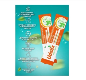 Пятновыводитель Udalix Oxy Ultra в стиках - это концентрированный экологичной пятновыводитель на основе активного кислорода, подходит для одежды, белья, обуви, обивки мебели, салона автомобиля, ковров, линолеума, керамической плитки, кухонных поверхностей. Эффективно удаляет пятна от травы, зеленки, йода, крови, вина, плесени, следов от шариковых ручек, а также от масел, смол, гудрона. Может использоваться, как для предварительного замачивании белья, так и для стирки со стиральным порошком, с целью увеличения его эффективности в борьбе с загрязнениями. Подходит для белых или цветных вещей, перед стиркой ознакомтесь с информацией, указанной производителем. Для ткани и поверхности с неустойчивом красителем стоит протестировать на незаметном участке. Один стик 25 г заменяет 100-150 г обычного пятновыводителя.