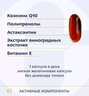 Коэнзим Q10 в форме убихинона для поддержания здоровой функции митохондрий и синтеза организмом клеточной энергии (АТФ). Способствует поддержанию естественного уровня CoQ10 в организме. Усилен полипренолами - природными биорегуляторами с научно-обоснованным действием и клинически доказанной эффективностью. В сочетании с антиоксидантами - астаксантином и экстрактом виноградной косточки обеспечивает особо высокую защиту от окислительного стресса. Повышает физическую активность, защищает от преждевременного старения.
