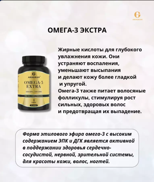 В продукте используется 75% концентрат рыбного жира в форме этилового эфира с низким индексом окисления TOTOX<11%, что гарантирует безопасность продукта. Именного эта форма омега-3 с высоким содержанием ЭПК и ДГК является активной в поддержании здоровья сердечно-сосудистой, нервной, зрительной системы, для красоты кожи, волос, ногтей.