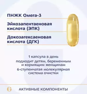 Омега-3 рыбный жир фармацевтического качества для всей семьи с высокой концентраций ПНЖК жирных кислот в 1 капсуле - ЭПК 600 мг и ДГК 240 мг.
