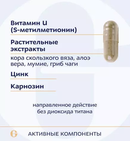 метилметионинсульфония хлорид (витамин U), вяза скользкого коры экстракт, алоэ вера гель экстракт, мумие экстракт, карнозин, чаги гриба экстракт, цинка цитрат. Вспомогательные вещества: целлюлоза микрокристаллическая (носитель), капсула желатиновая (желатин, глицерин (агент влагоудерживающий)), кальция стеарат (агент антислеживающий), кремния диоксид (агент антислеживающий).