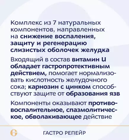 Сочетание 7 натуральных компонентов комплексного действия – витамина U, карнозина с цинком, экстрактов. Активирует процессы восстановления клеток слизистой оболочки желудка и кишечника при функциональных расстройствах ЖКТ.