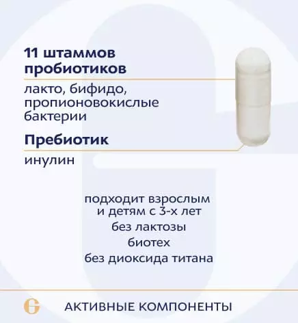 Уникальный синбиотик из консорциума 11 штаммов пробиотиков и пребиотика для взрослых и детей с 3-ех лет для многофакторной коррекции микробиома кишечника. Подходит беременным и кормящим женщинам, людям с лактазной недостаточностью.