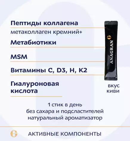 «Метаколлаген кремний+» (коллаген гидролизованный, вода минеральная), изомальтулоза, «Аминоцидин» (пептиды сывороточного белка, ферментированного микроорганизмами Lactococcus lactis subsp. diacetylactis и Lactococcus lactis cremoris), метилсульфонилметан, лимонная кислота (регулятор кислотности), витамин С (L- аскорбат кальция), витамин К2 (менахинон), гиалуроновая кислота, минеральная композиция каменное масло Горного Алтая (соль пищевая серии «Каменное масло», магния цитрат, цинка цитрат), ароматизатор натуральный «Киви», витамин D3 (холекальциферол), витамин Н (L-биотин).
