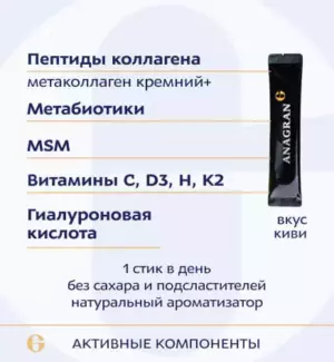 Комплекс содержит пептиды коллагена I и III типов, обогащенные кремнием, МСМ, гиалуроновой кислотой и комплексом витаминов в каждом стик-пакете.