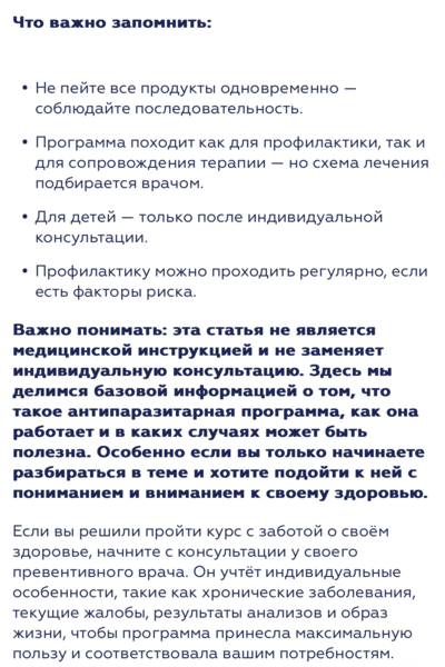 Важно понимать: эта статья не является медицинской инструкцией и не заменяет индивидуальную консультацию. Здесь мы делимся базовой информацией о том, что такое антипаразитарная программа, как она работает и в каких случаях может быть полезна. Особенно если вы только начинаете разбираться в теме и хотите подойти к ней с пониманием и вниманием к своему здоровью.