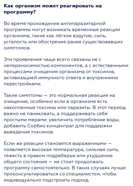 Во время прохождения антипаразитарной программы могут возникать временные реакции организма, такие как лёгкое вздутие, сыпь, усталость или обострение ранее существовавших симптомов.