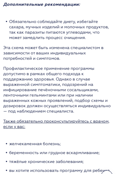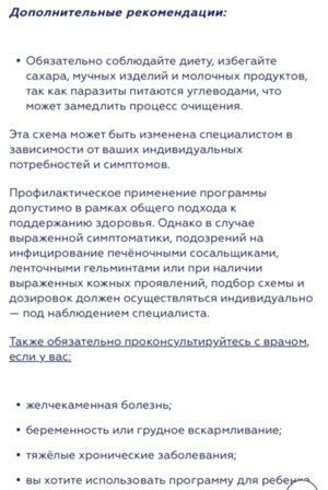Профилактическое применение программы допустимо в рамках общего подхода к поддержанию здоровья. Однако в случае выраженной симптоматики, подозрений на инфицирование печёночными сосальщиками, ленточными гельминтами или при наличии выраженных кожных проявлений, подбор схемы и дозировок должен осуществляться индивидуально — под наблюдением специалиста.