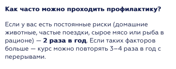 Если у вас есть постоянные риски (домашние животные, частые поездки, сырое мясо или рыба в рационе) — 2 раза в год. Если таких факторов больше — курс можно повторять 3–4 раза в год с перерывами.