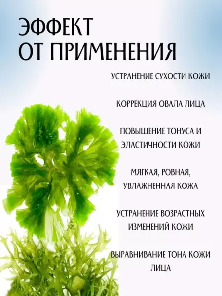 Возрождающее действие на кожу оказывают входящие в состав водорослей полисахариды, микро- и макроэлементы, витамины, аминокислоты, полиненасыщенные жирные кислоты, фукостерин, альгиновая кислота.