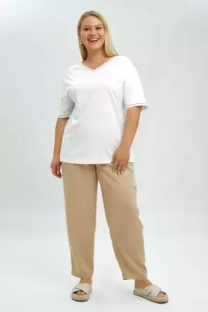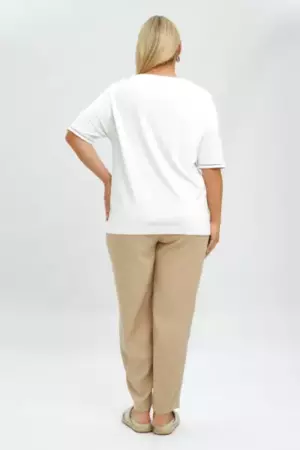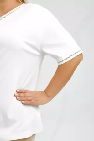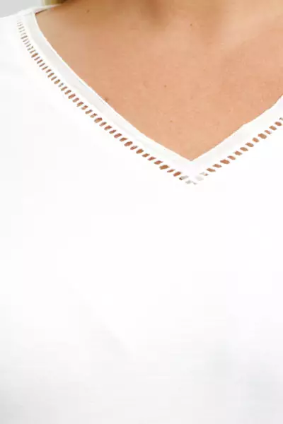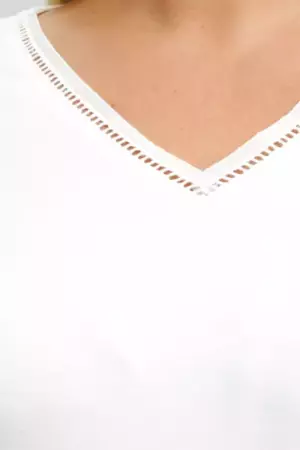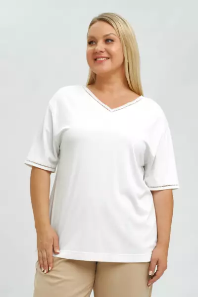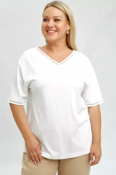 Футболка А - силуэта с тесьмой-мережкой по горловине и рукаву. V-образный вырез. Спущенное плечо. Модель выполнена из трикотажа с высоким содержанием вискозы и нейлона. Футболка в базовом белом цвете с деликатной отделкой в виде тесьмы (имитация вышивки мережки-«столбики») дополните широкими льняными брюками и аксессуарами в стиле рустик.