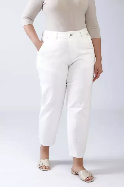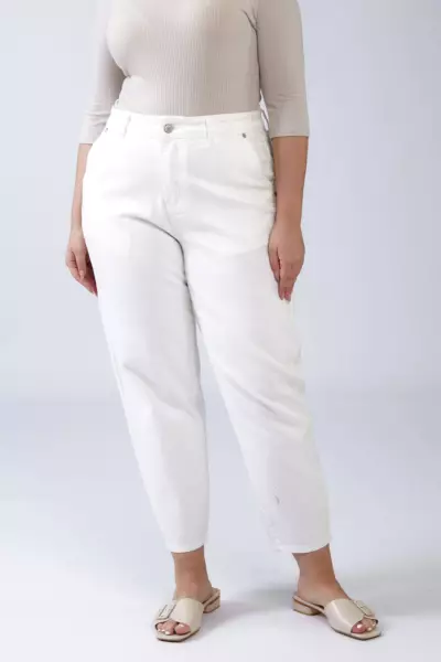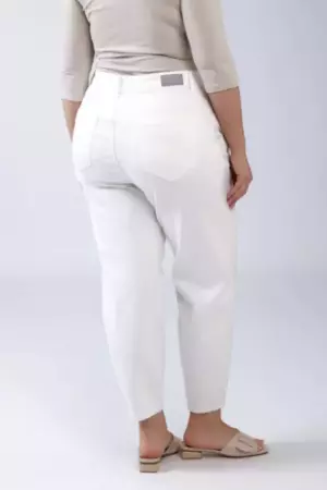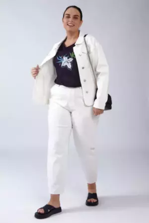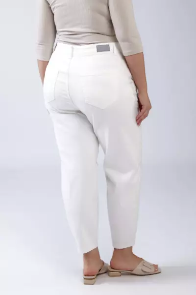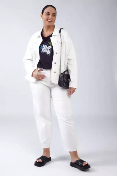 Базовые джинсы "бананы". Пояс со шлевками под ремень. Карманы спереди и сзади. Деним с добавлением эластана. Модель, в нейтральном белом цвете, дополните футболкой или джинсовой курткой из этой же капсулы.