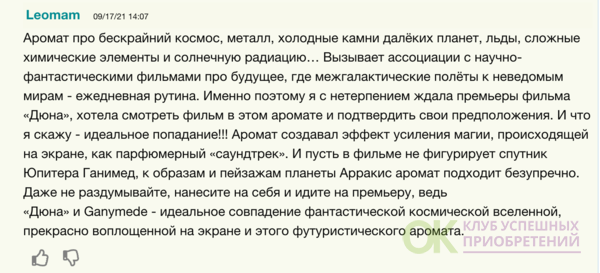 Сначала напомнил мазь Вишневского. Через какое то время появилась мысль, может и мазь, но так хорошо в нем, вдохнул и кайф, умиротворение, вкусно. Со временем (возможно, отливант просто постоял, а может мой настрой изменился) я почувствовала глянцевый журнал, или мандарин в космосе, или не знаю что, но без великого и ужасного Ганимеда я больше жить не могу, теперь у меня есть флакон и были только комплименты, спасибо что дали возможность познакомиться нам❤️