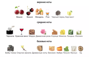 Ноты: ландыш, миндаль, уд, ром, корица, бензоин, чернила, красное вино, амбра, пачули, древесные ноты, бобы тонка, жасмин, бергамот, мимоза, вишня, дамасская роза, мирра, мускус, черный перец