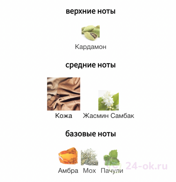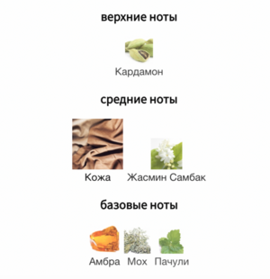 Аромат раскрывается пряными нотами кардамона и шафрана, звучание которых дополняют цветочные, притягательно сладкие акценты индийского жасмина из самого сердца пустыни. Насыщенные аккорды черной кожи обволакивают своим чувственным ароматом, а соблазнительные оттенки древесины, пачули и ветивера придают композиции почти осязаемую текстуру. Легкие, едва заметные ноты белого мха и теплой амбры навевают образ согретой солнцем земли каньона, раскрываясь ароматом раскаленных камней и песка.