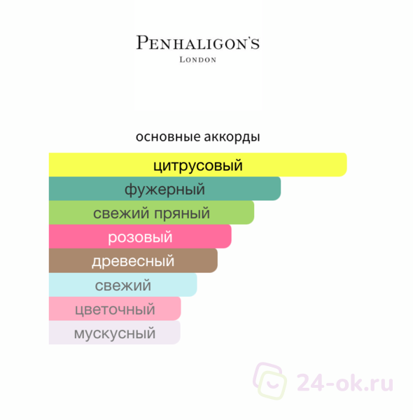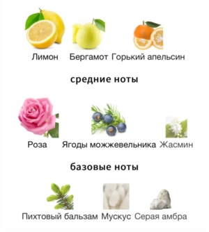 Ноты: ягоды можжевельника, серая амбра, лимон, жасмин, бергамот, роза, пихта (канадский бальзам), мускус, горький апельсин