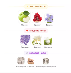Ноты: гранат, сандал, вистерия, яблоко, кашемировое дерево, кашмеран (сashmeran), фрезия, жасмин, фиалка