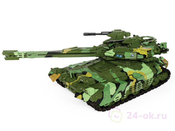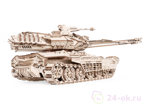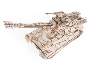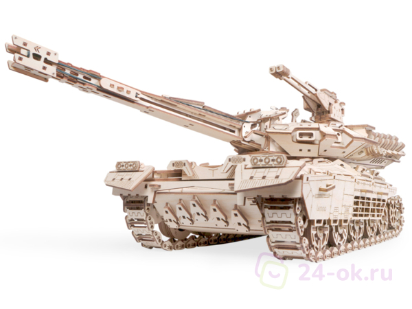 Габаритные размеры: 500 х 205 х 165 мм. У собранной модели вращается башня, пушка, подвеска с амортизацией, вращаются колёса, гусеницы. Фиксируется пушка. Открываются люки. Вращаются пулемёты. Пушка заряжается и стреляет снарядами из фанеры. Дальность стрельбы до 10 м.